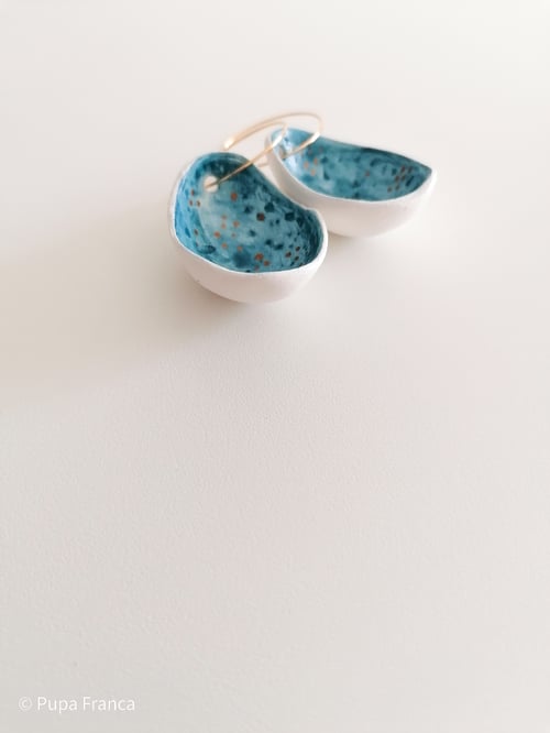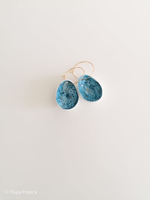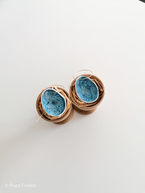 New 'Eggshell' earrings in blue with golden dots and matte white outer Eggshell and golden stainless steel hoops. The idea and inspiration is of course Easter time, but also the idea of the new life emerging that brings so much joy, happiness and color... Here, the painted part is the inside of the eggshell while the outer stays white. The opposite of what we usually paint on Easter. I wanted to accentuate that it's the inner part that matters the most, the part you bring out to the world, the ways you shine and the outer is only the carrier of all that. They are very light and comfortable to wear.